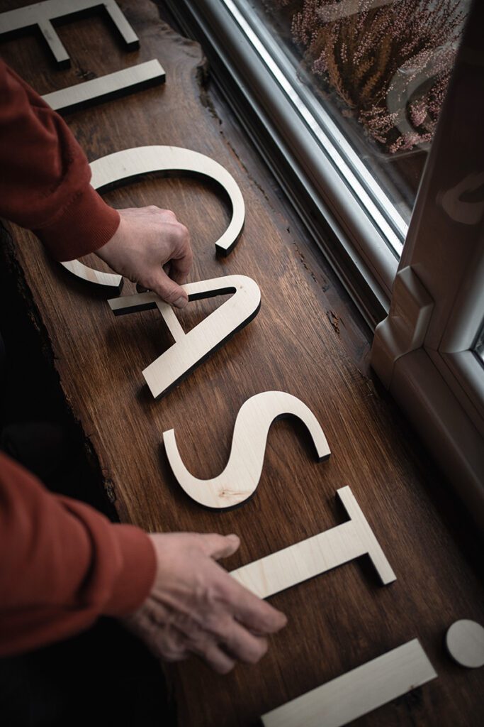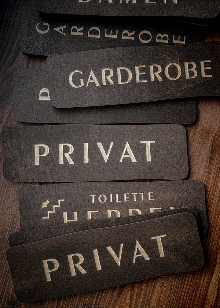 For El Castillo, we created a complete wooden signage system – from room labels for the kitchen, restrooms, and wardrobe to a large exterior sign with laser-cut letters.